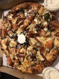 Pizza sauce, eggplant, mozzarella, parmesan, goat cheese & roast red peppers.